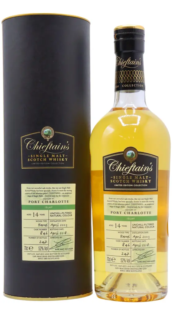 An independent bottling of Port Charlotte from Ian Macleod under the "Chieftain's" brand. A single cask release aged for 14 years in a standard size oak barrel (about 200 litres and usually ex-Bourbon) A heavily peated offering distilled at The Bruichladdich distillery. Distilled April 2003 & bottled April 2018 and bottled at 52% ABV. Non chill filtered and natural colour.
